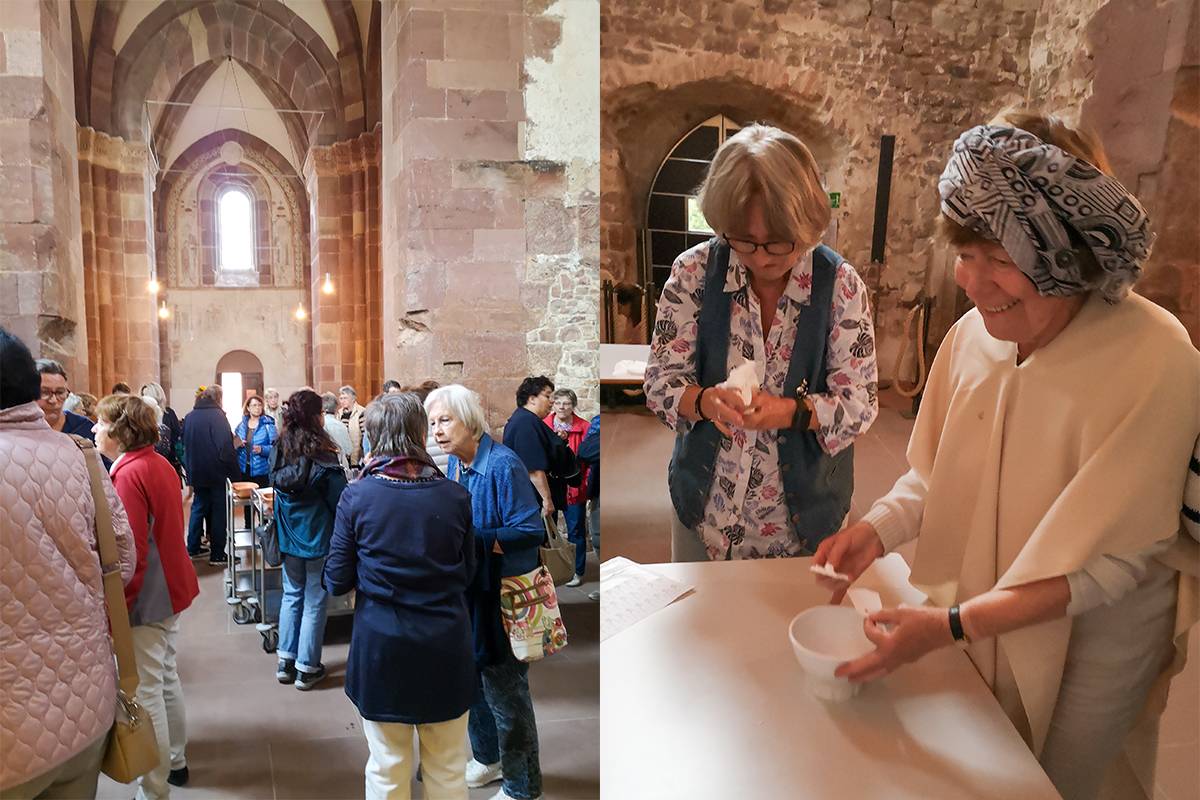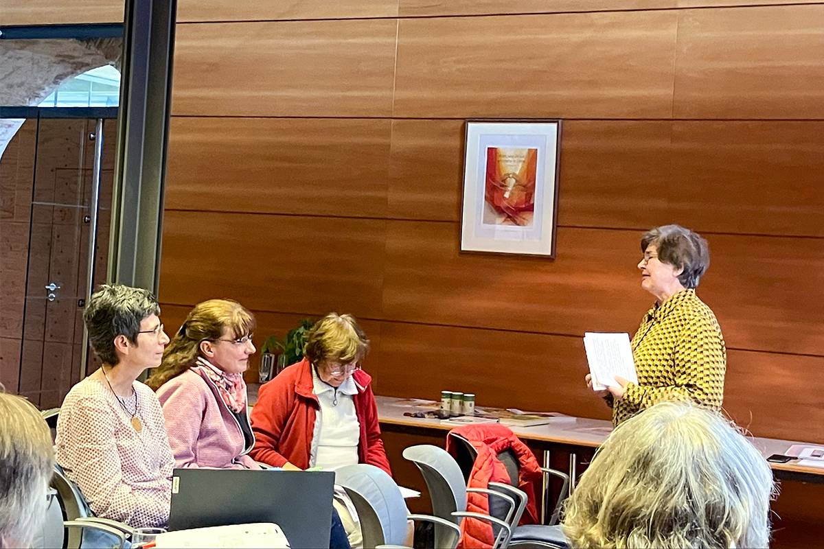 Nachdem Alle in das Leben und die Lebensumstände der Hildegard von Bingen, die kulturell in großer Weite zur Universalgelehrten wurde, eingetaucht waren, gab eine Pause Gelegenheit zur Stärkung. Danach stand der "Ordo virtutum", ein musikalisches Singspiel von Hildegard von Bingen, im Mittelpunkt. In der Klosterkirche rund um den Altar versammelten sich die Frauen. Mit dem Hineinhören in das Singspiel und einer Inszenierung, welche alle Teilnehmerinnen mit einbezog, gelang es, etwas von der Theologie und dem Glauben der Hildegard von Bingen, aktuell werden zu lassen. Es ging der einen oder anderen Frau unter die Haut.