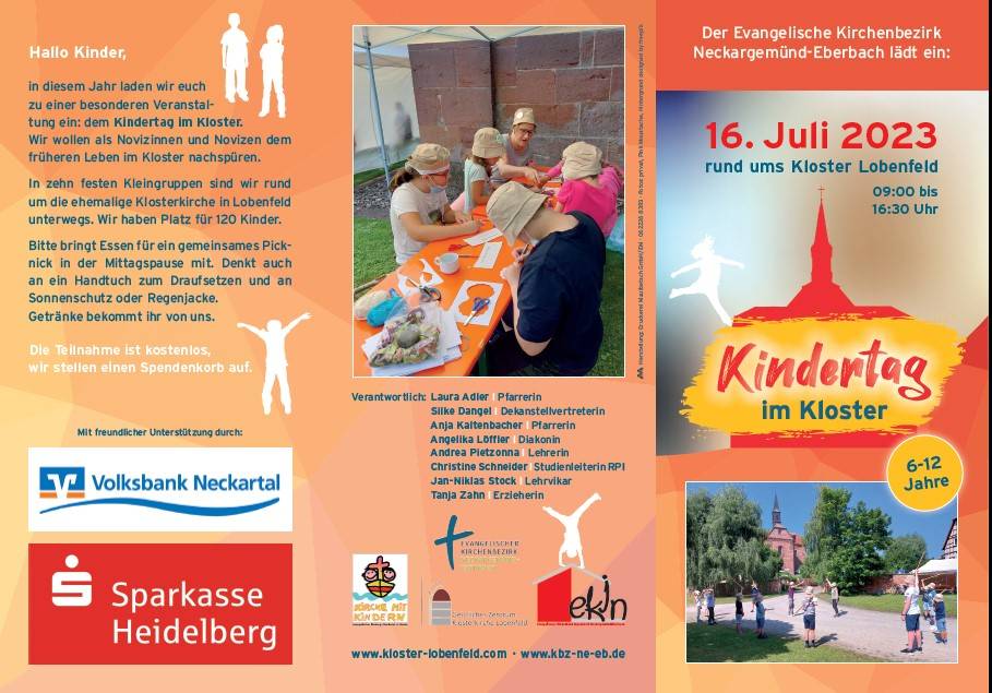 Veranstalter sind die Evangelische Kindergottesdienstarbeit, das Evangelische Schuldekanat des Kirchenbezirks Neckargemünd-Eberbach, das Evangelische Kinder- und Jugendwerk des Kirchenbezirks, das Geistliche Zentrum Klosterkirche Lobenfeld. Hallo Kinder,